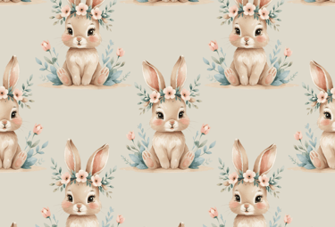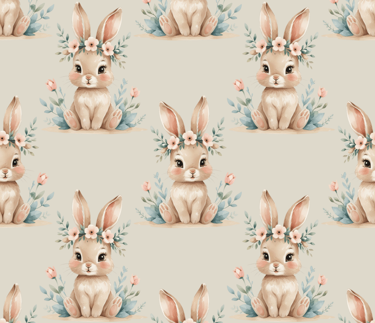 Bring a touch of tenderness to your creations with this adorable watercolor rabbit holding a bell. Surrounded by soft pastel leaves and a tiny pumpkin, this seamless pattern is perfect for baby shower decorations, nursery prints, invitations, and digital backgrounds. Its delicate tones of beige, pink, and mint green add a cozy and elegant feeling to any design.